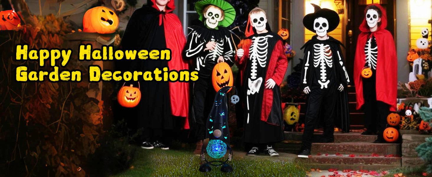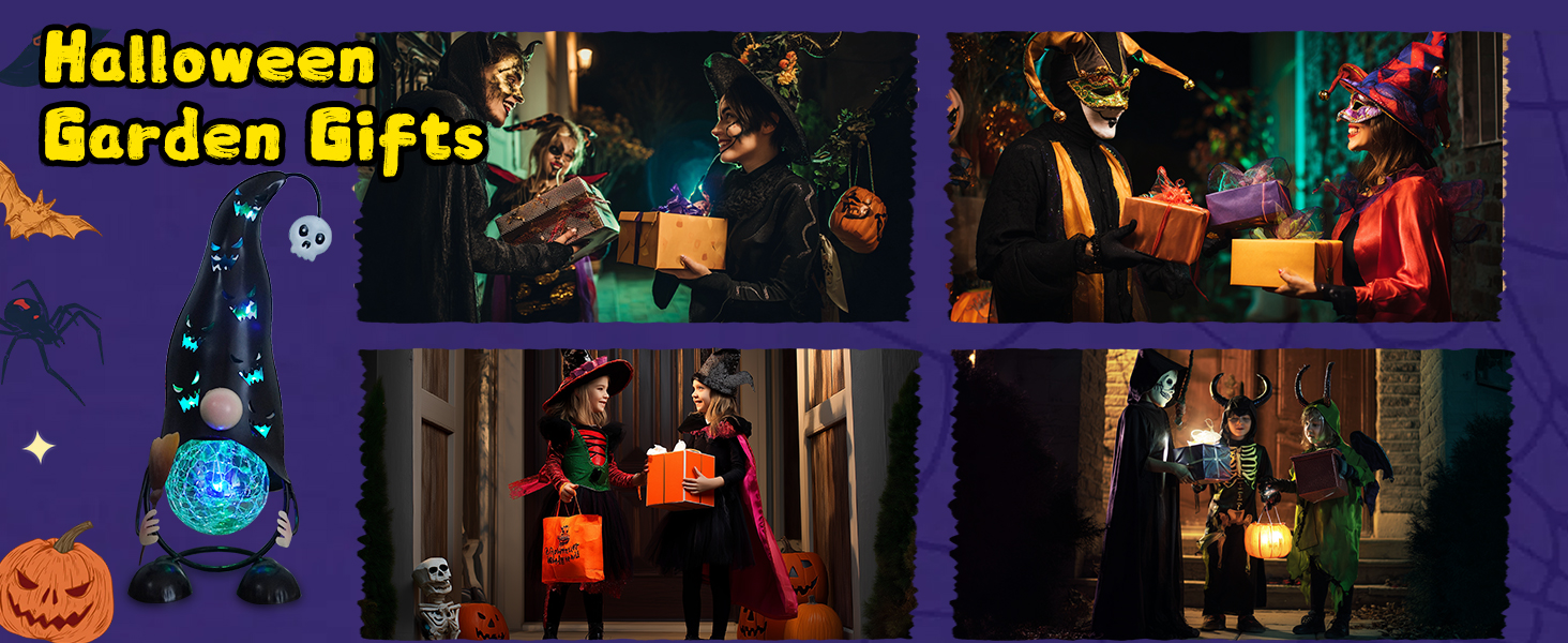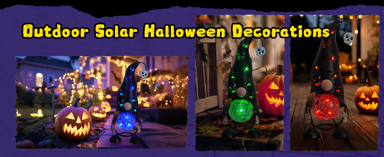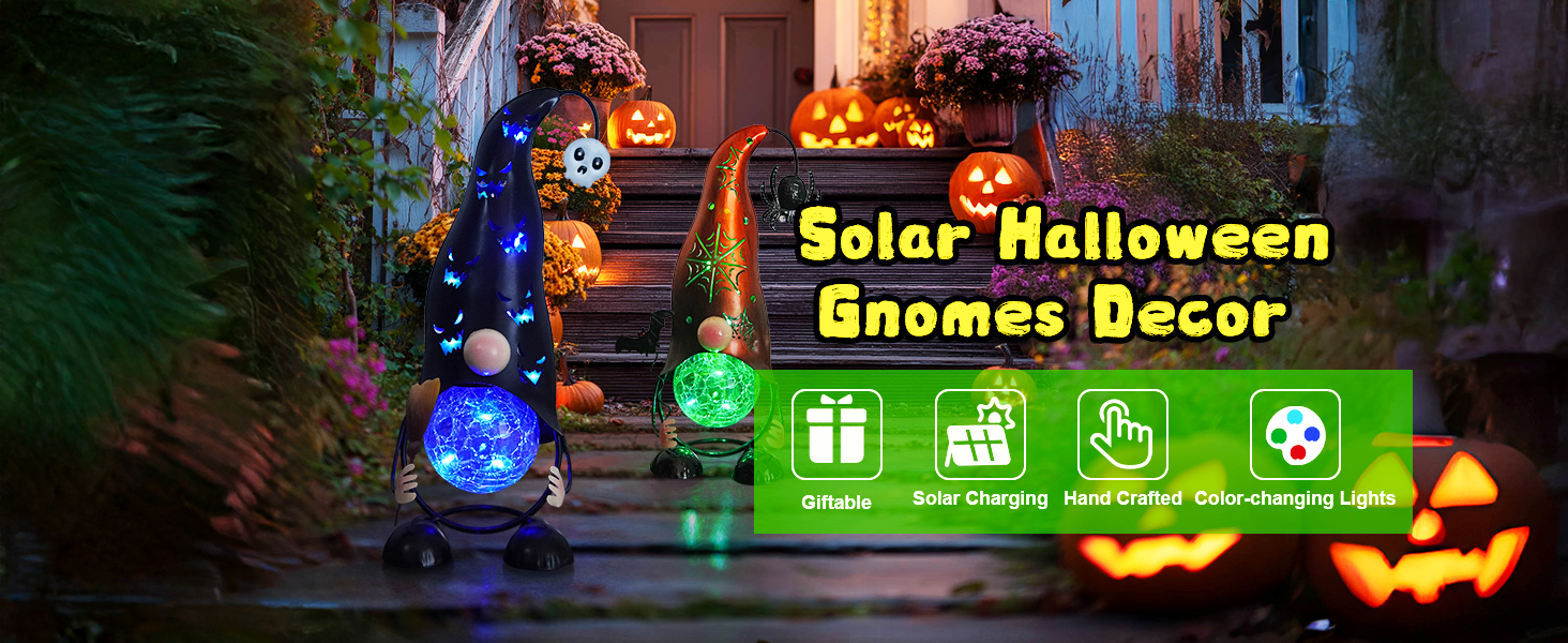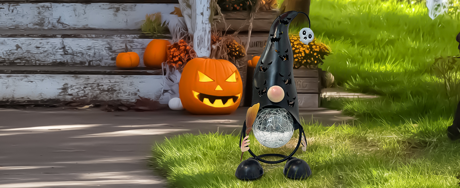 This adorable solar-powered gnome offers charming Halloween decor with its hollowed-out metal Jack-O’-Lantern hat and witch’s broom. The color-changing LED lights create a spooky-cute ambiance by projecting eerie shapes and shadows through the design. Crafted from weather-resistant metal, it’s perfect for outdoor placement in gardens or pathways and automatically illuminates at dusk for effortless festive charm.