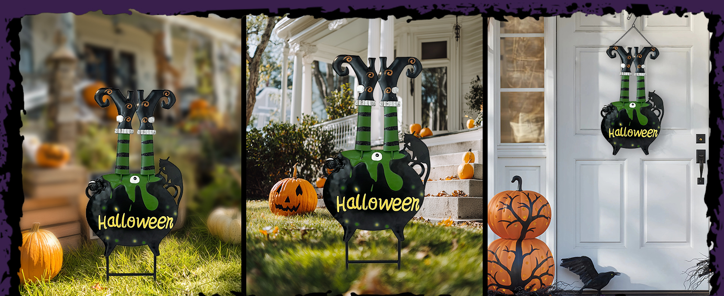 Design: A spooky witch cauldron garden stake with whimsical details including witch feet sticking out, an eyeball, and a black cat.