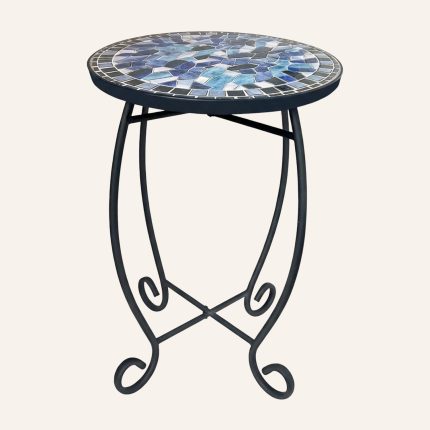 12″ Blue Mosaic Outdoor Side Table – Ceramic Tile Top with Black Metal Frame