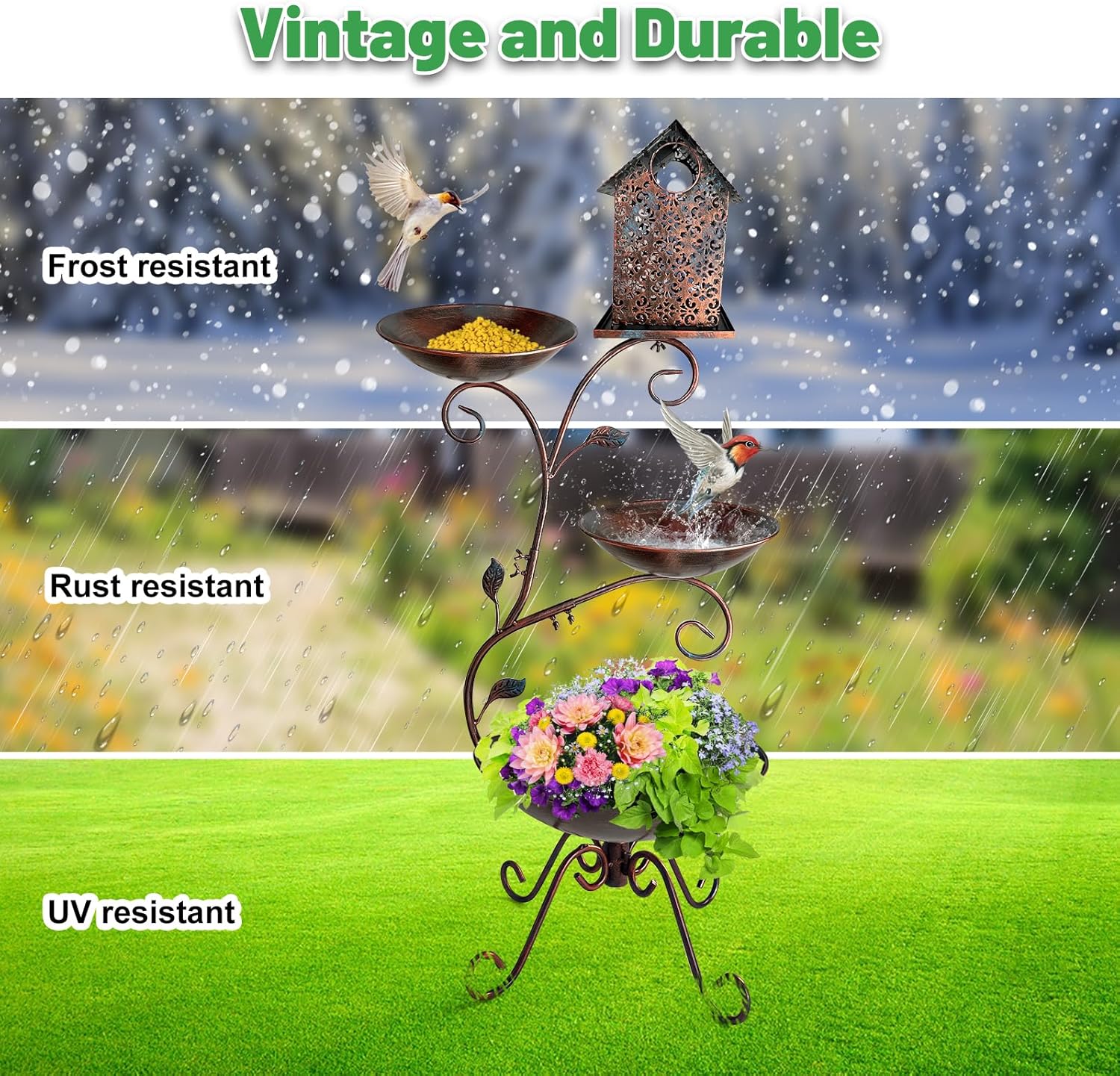 Crafted from robust cast iron, this solar bird bath is engineered for outdoor resilience! Equipped with U-shaped ground stakes, it anchors firmly into soil to resist tipping in wind, rain, or snow. The multi-layer powder-coated finish ensures long-lasting rust resistance, while the smooth surface makes cleaning a breeze—so it stays vibrant and functional through every season.