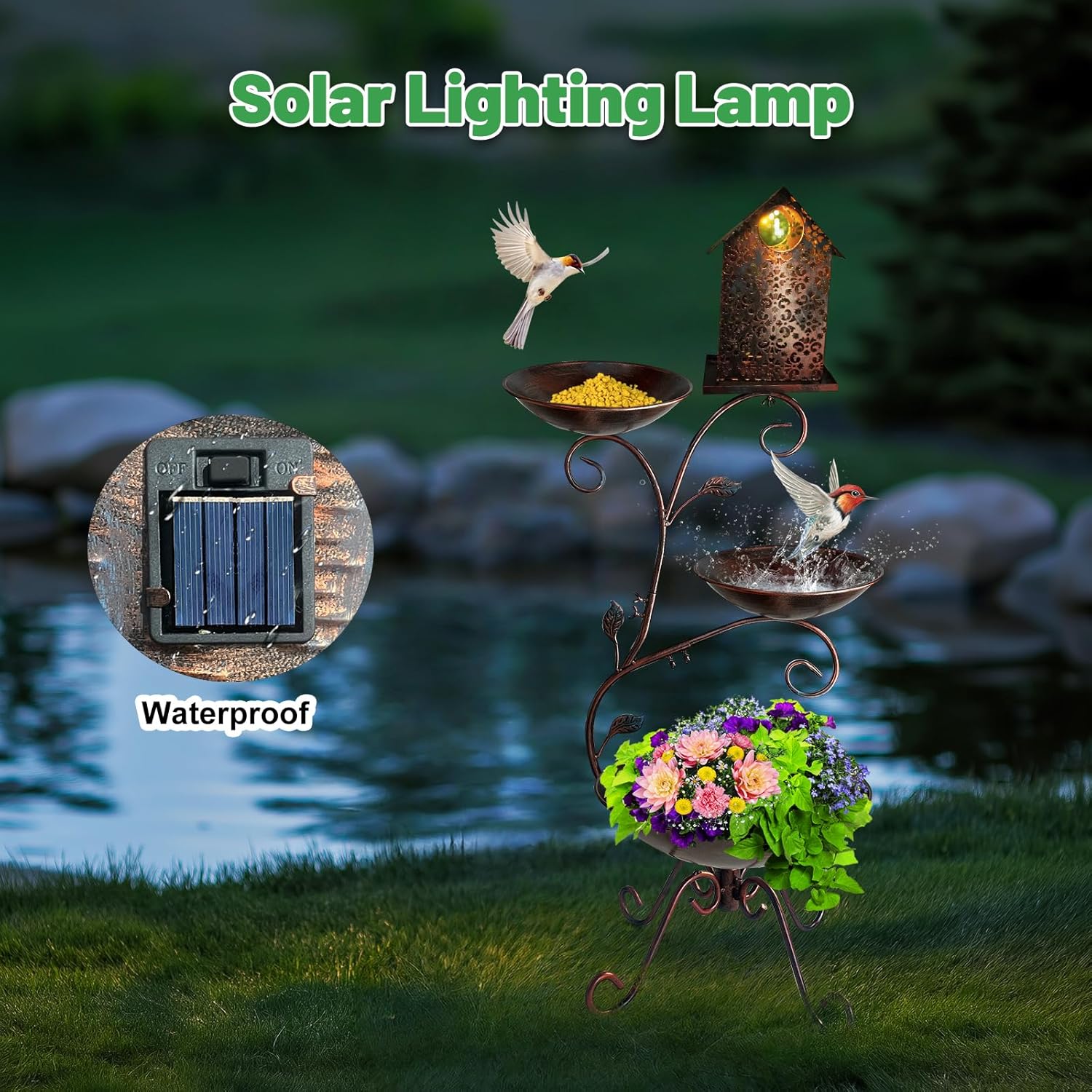 Merge function with magic! This bird bath integrates a high-efficiency solar panel and classic planter design. Just 5 hours of direct sunlight charges the battery to deliver 8+ hours of soft, warm illumination at dusk—casting a charming glow that elevates your garden’s nighttime appeal while drawing birds to your yard by day.