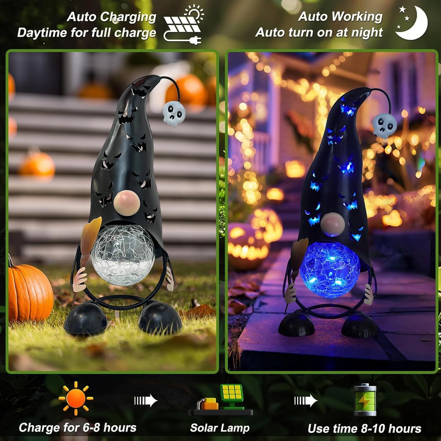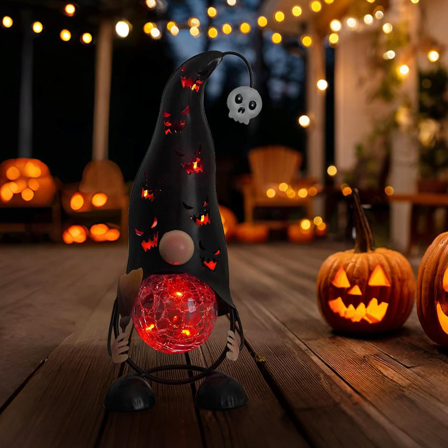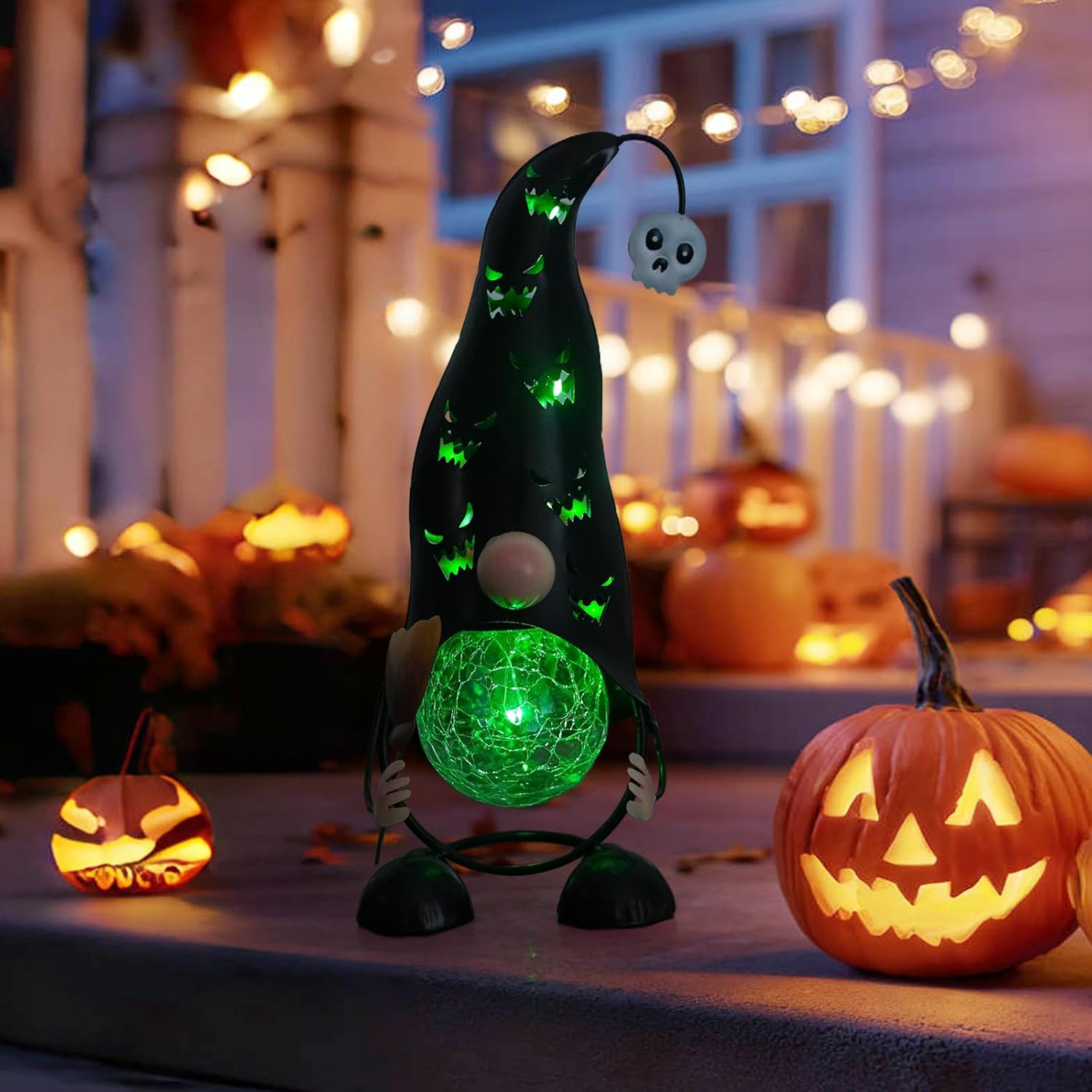 This adorable solar-powered gnome offers charming Halloween decor with its hollowed-out metal Jack-O’-Lantern hat and witch’s broom. The color-changing LED lights create a spooky-cute ambiance by projecting eerie shapes and shadows through the design. Crafted from weather-resistant metal, it’s perfect for outdoor placement in gardens or pathways and automatically illuminates at dusk for effortless festive charm.