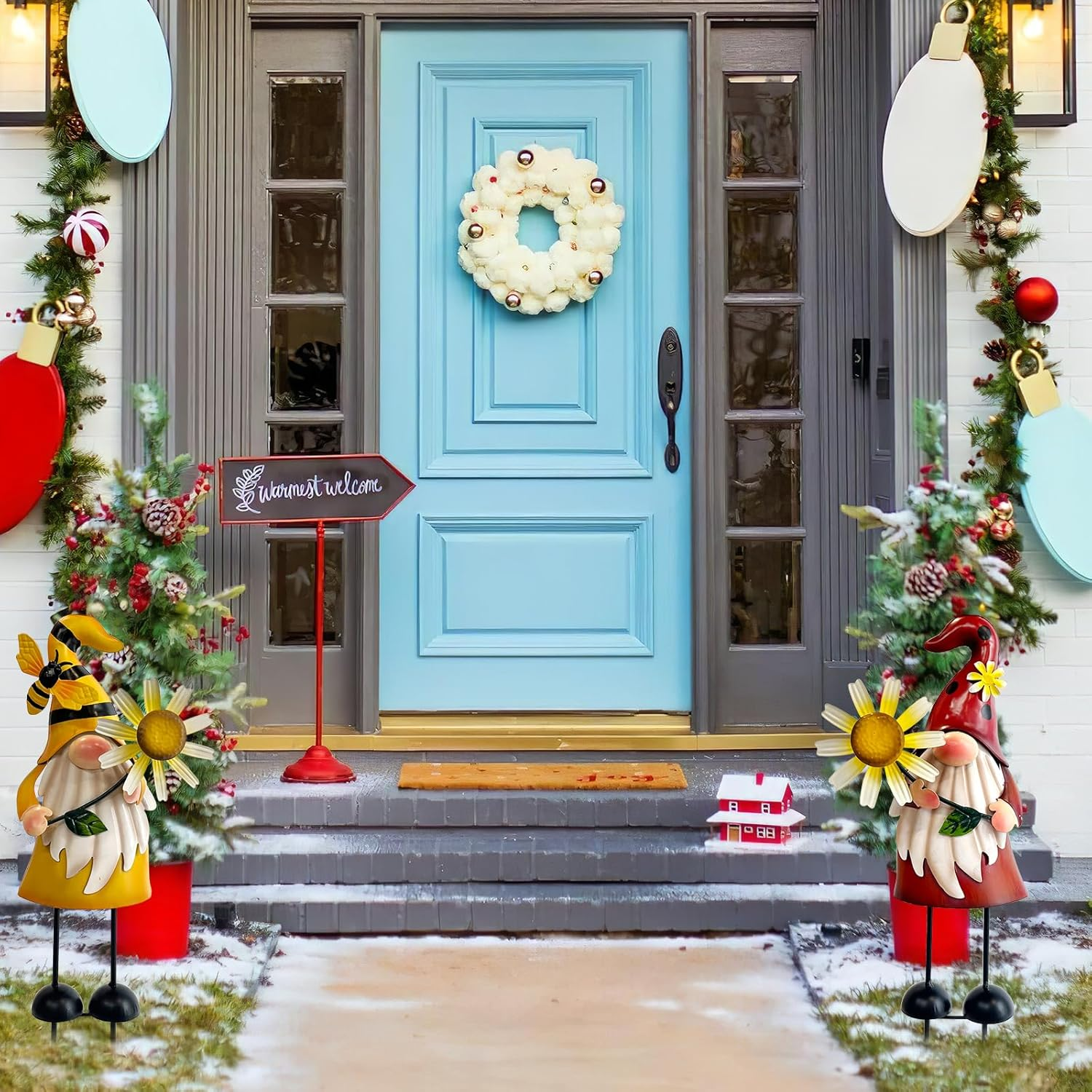 Brighten up your lawn/patio with this 2-piece metal gnome set — one dressed as a ladybug (red polka-dot hat + daisy accent) and the other as a bee (yellow striped hat + bee detail), each holding a glowing sunflower (light-catchy resin petals!). Their fluffy white beards + wobbly spring legs add playful charm that sways gently in the breeze.