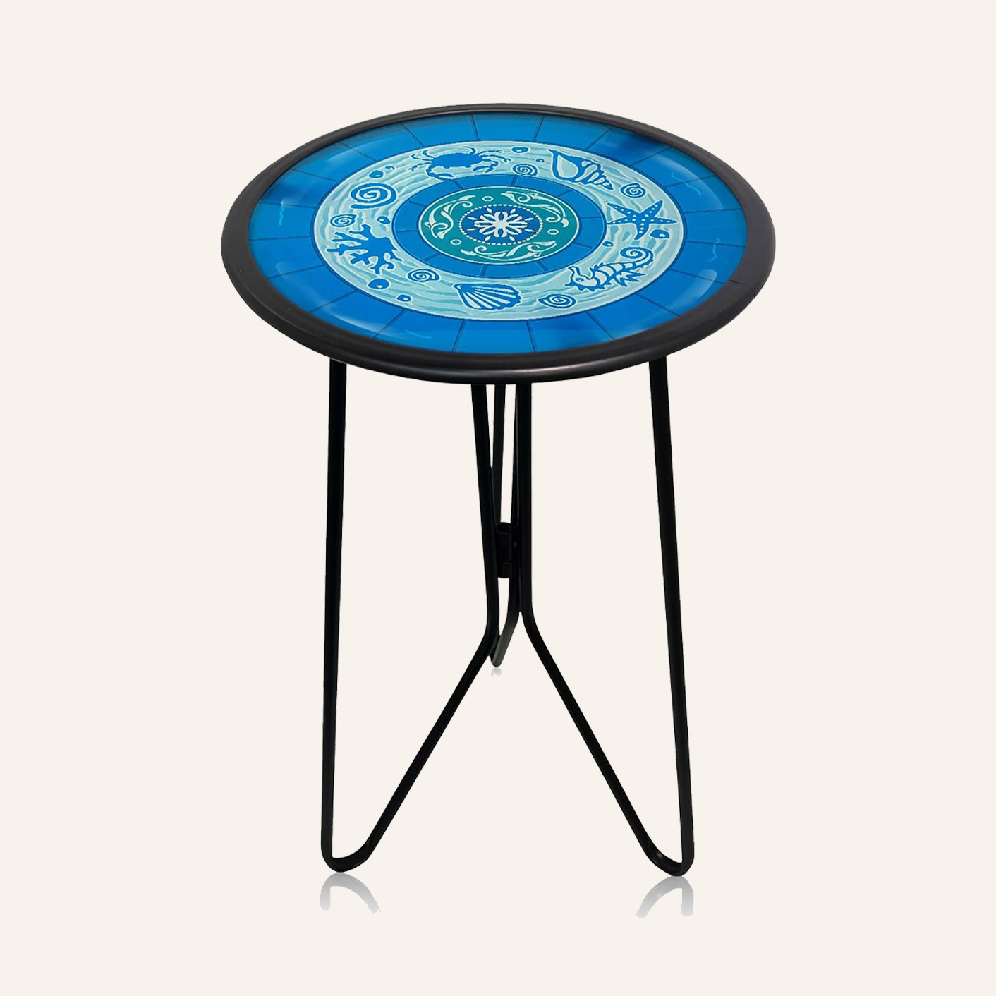 - 【Pretty Glass Outdoor Side Table】The coffee table consisted of round glass top and the pattern of seahorse,starfish,conch,crabs,corals,fish and shells .Clear texture and bright colors make the patio table more beautiful.