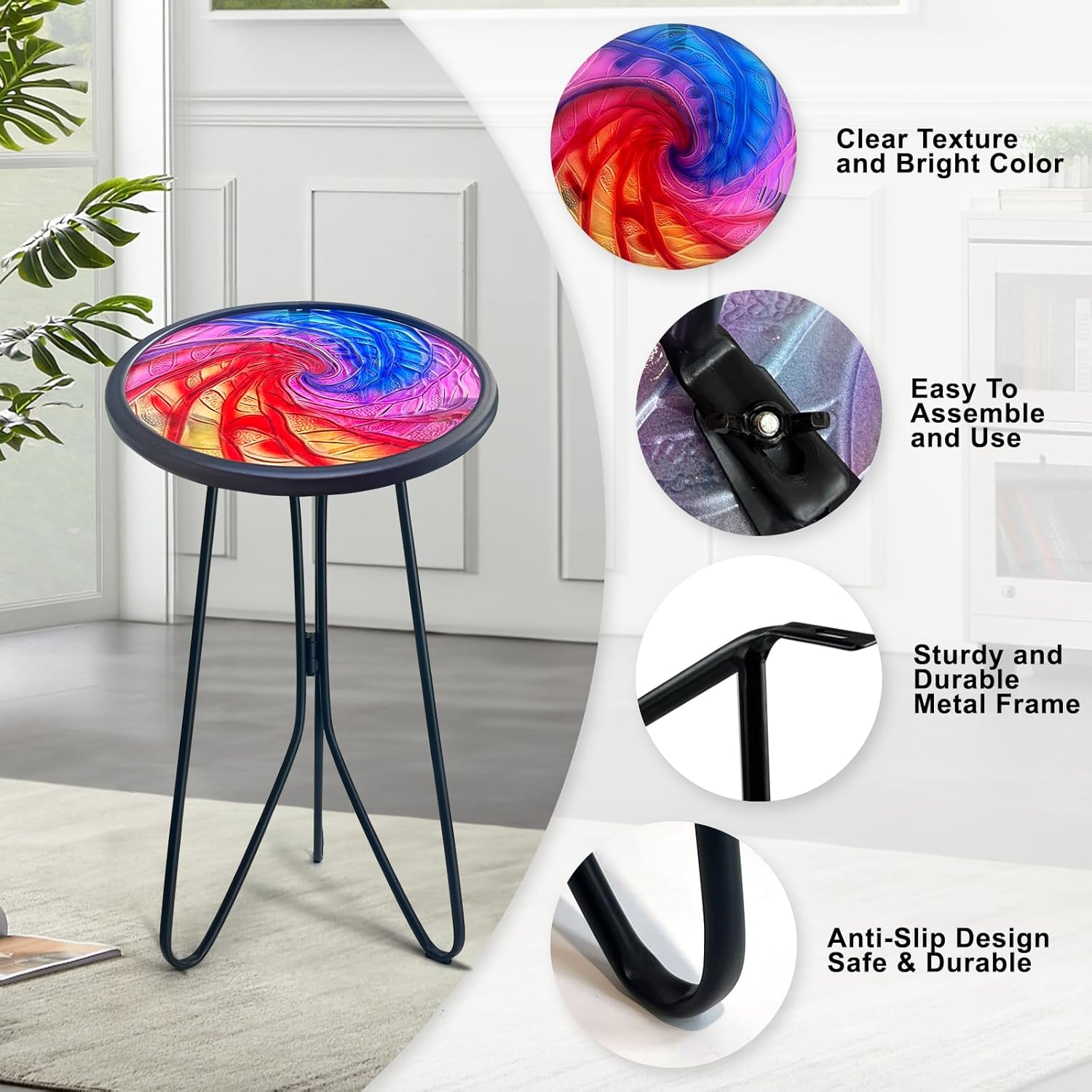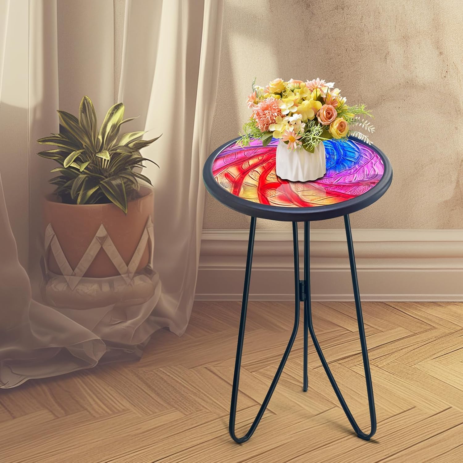 This metal side table can be used indoors and outdoors. Enjoy moments of relaxation with it either placed in the living room, on the side of sofa, bed, in a corner of the room as a serving table, for your potted plants, little coffee breaks, and books. Also perfect in the garden, yard, balcony