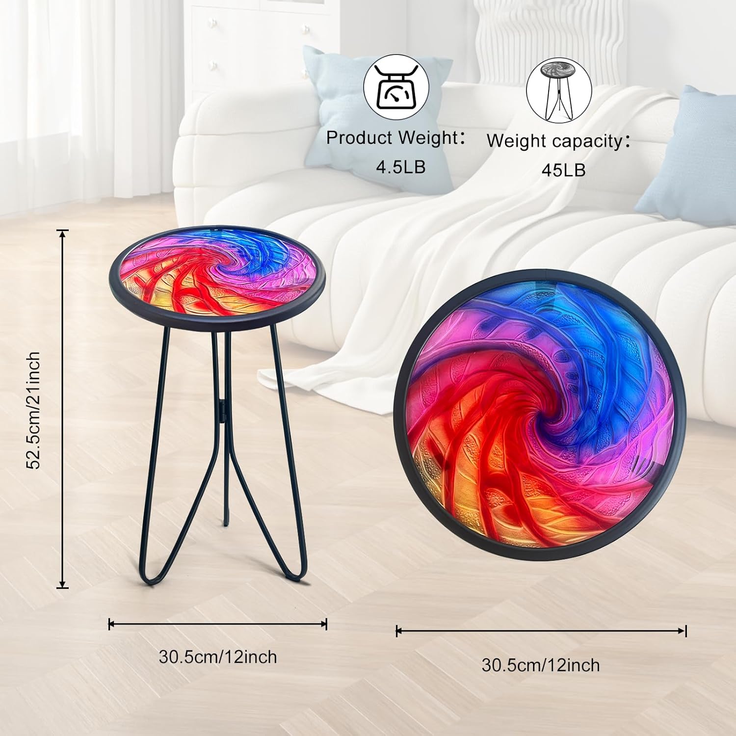 - 12-inch round table with 21-inch height, ideal for intimate settings