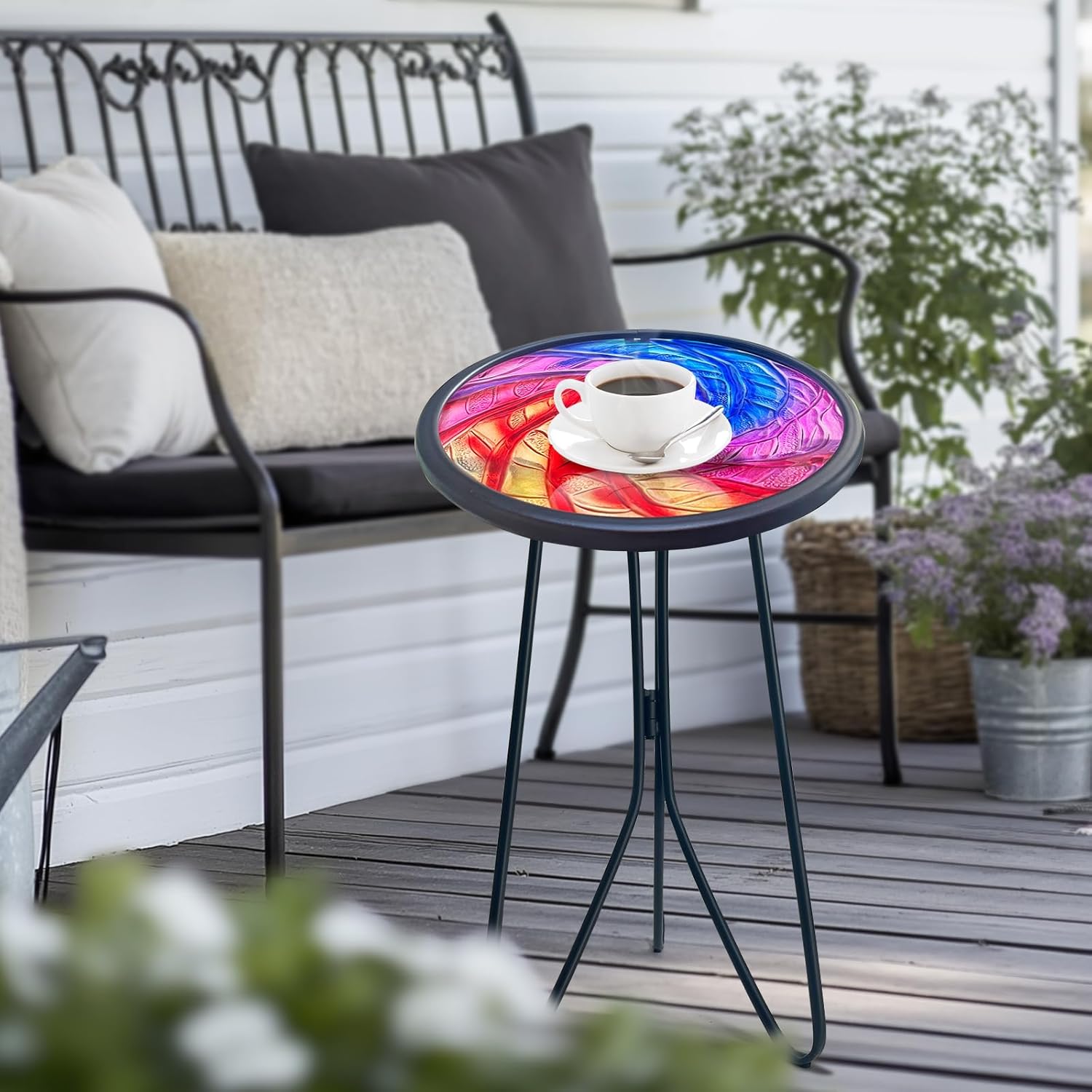 - Perfect placement between patio rocking chairs or wicker porch chairs