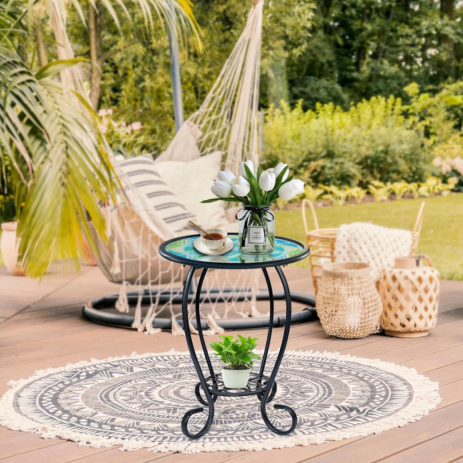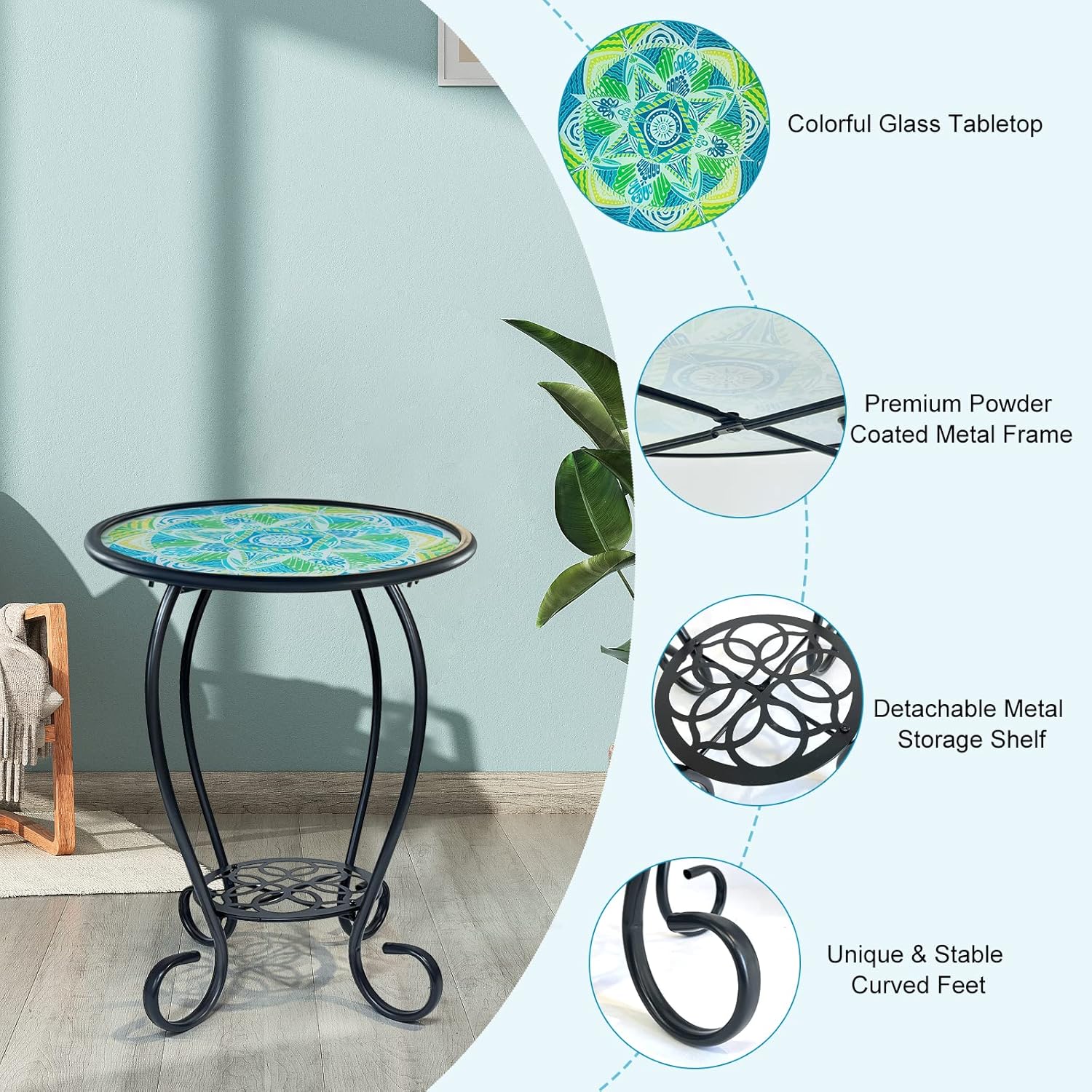 This round side table features a handcrafted glass top adorned with a vibrant mandala leaf mosaic pattern, boasting crisp textures and vivid green hues that blend seamlessly into your yard, garden, or patio. Its elegant design instantly elevates any indoor or outdoor space, turning ordinary areas into eye-catching focal points.