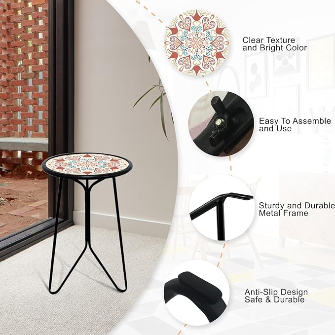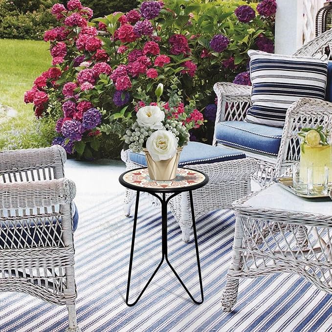 - 【Simple Assembly & Easy to Use】Install this mosaic outdoor table with ease, no tools required, just turn the three wing nuts, and it will be complete in 2-3 minutes. The sturdy metal structure of the patio end table provides a beautiful and practical surface for your plant stands and other outdoor plants. You’ll be amazed by the quality of this great product.