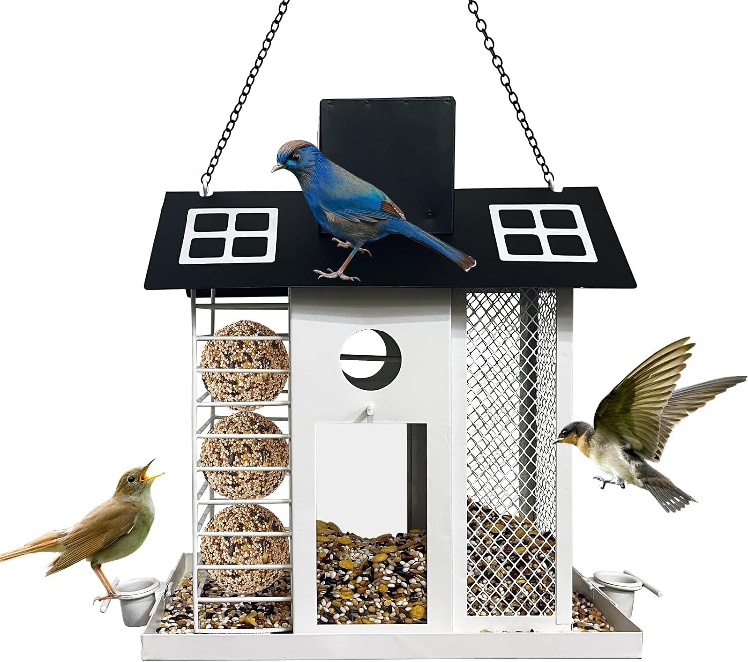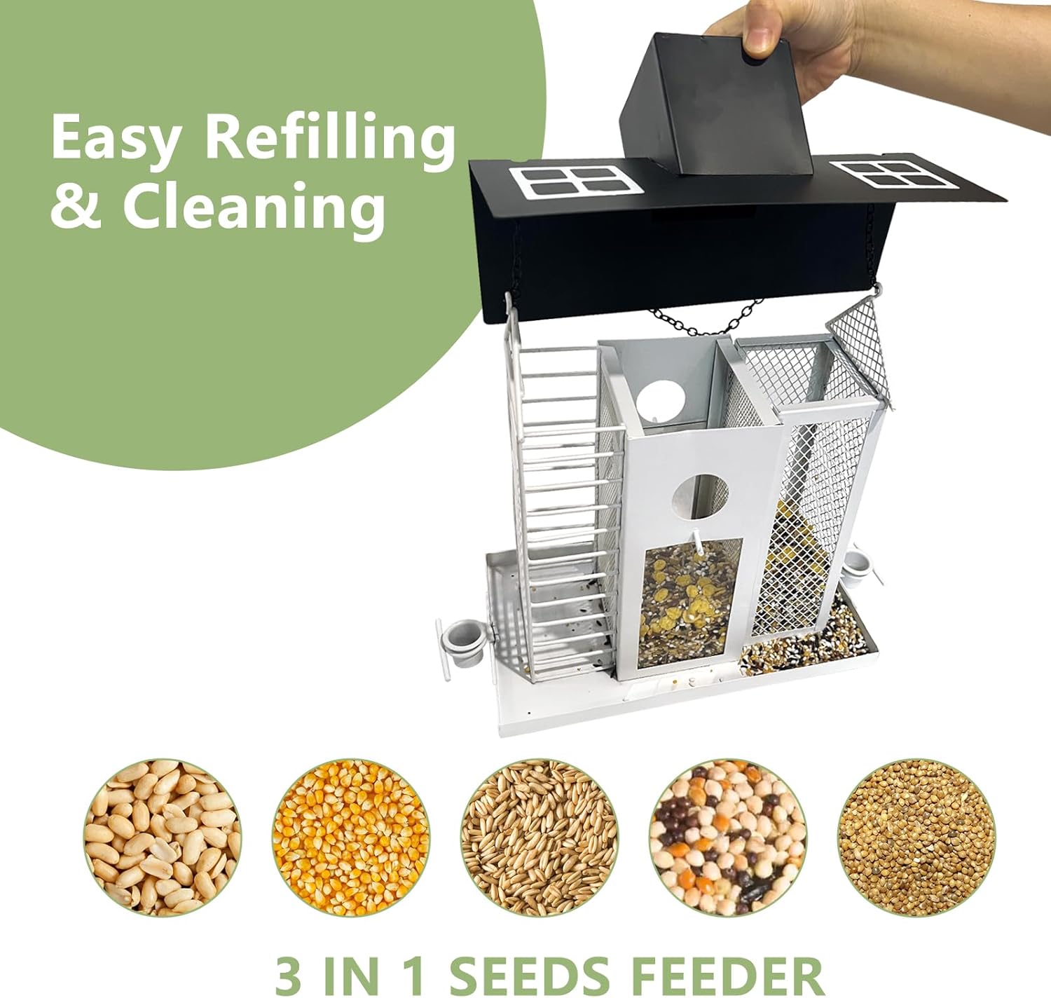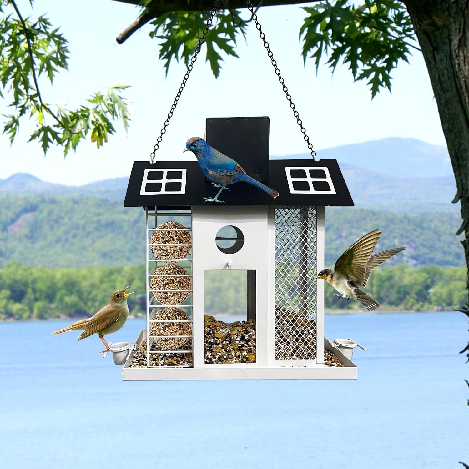 Three separate compartments let you fill different seeds to attract a wide variety of birds: small mesh for thistle (ideal for finches) and larger openings for sunflower seeds (perfect for cardinals and blue jays). This design reduces competition and creates a peaceful feeding environment for all your backyard visitors.