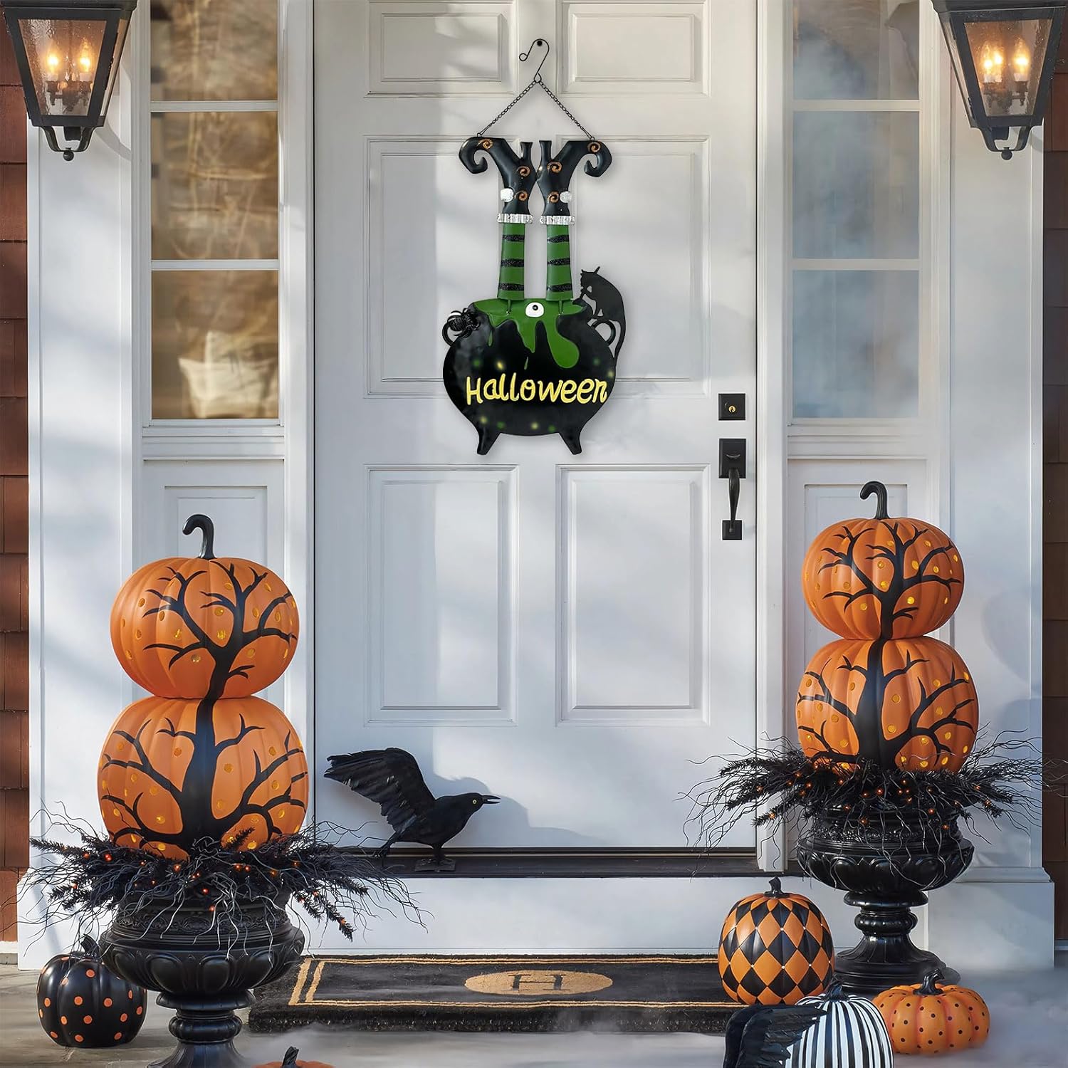 This striking 31-inch tall garden stake features a whimsical witch cauldron design, complete with witch feet sticking out, and accented by a black cat and an eyeball. Crafted from durable iron to withstand the elements, it creates a highly visible and spooky addition to your outdoor Halloween decor, perfect for placing in gardens, on lawns, or porches.